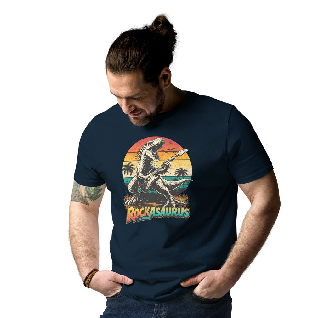 A bold rock dinosaur design that blends music, attitude, and retro sunset energy into a standout everyday graphic.