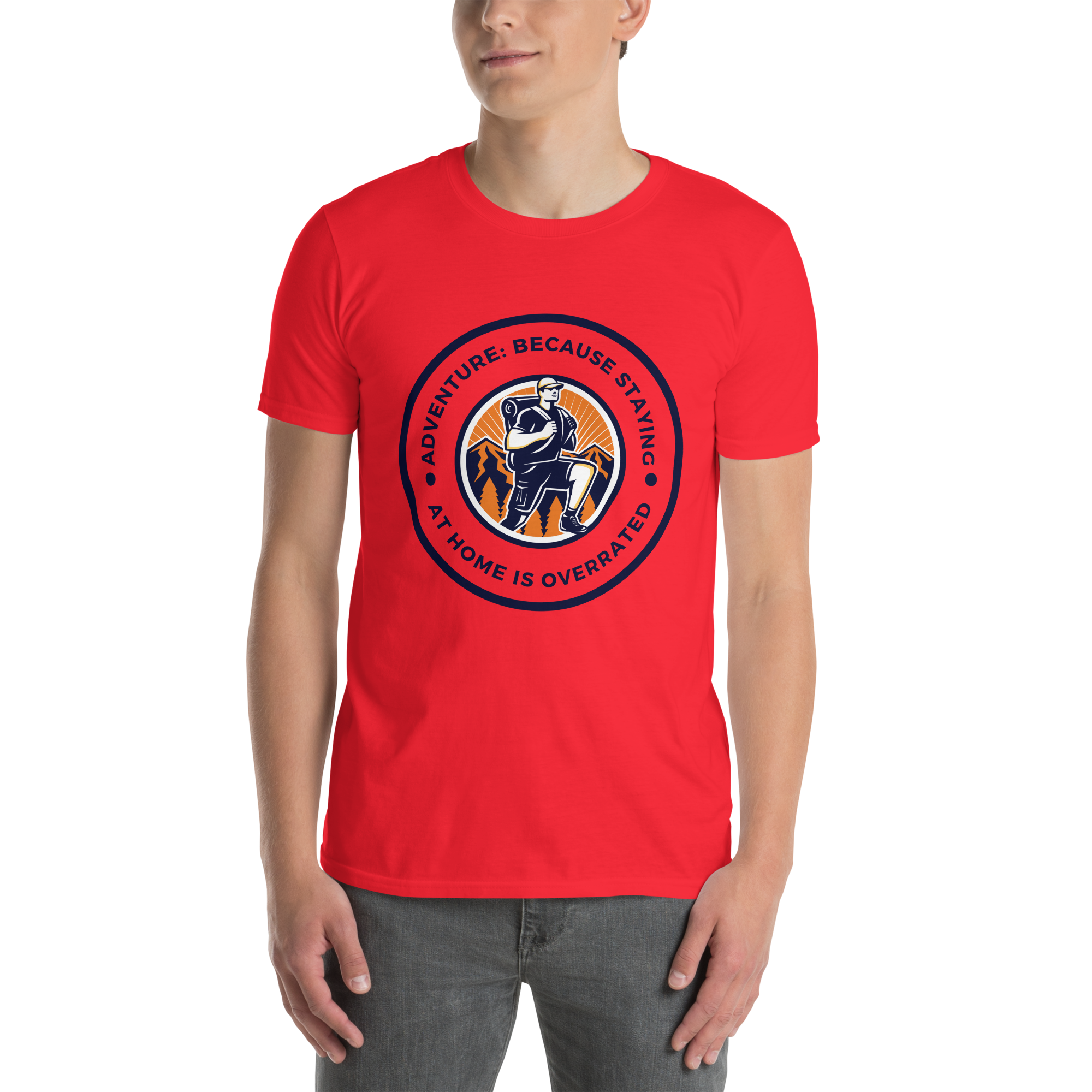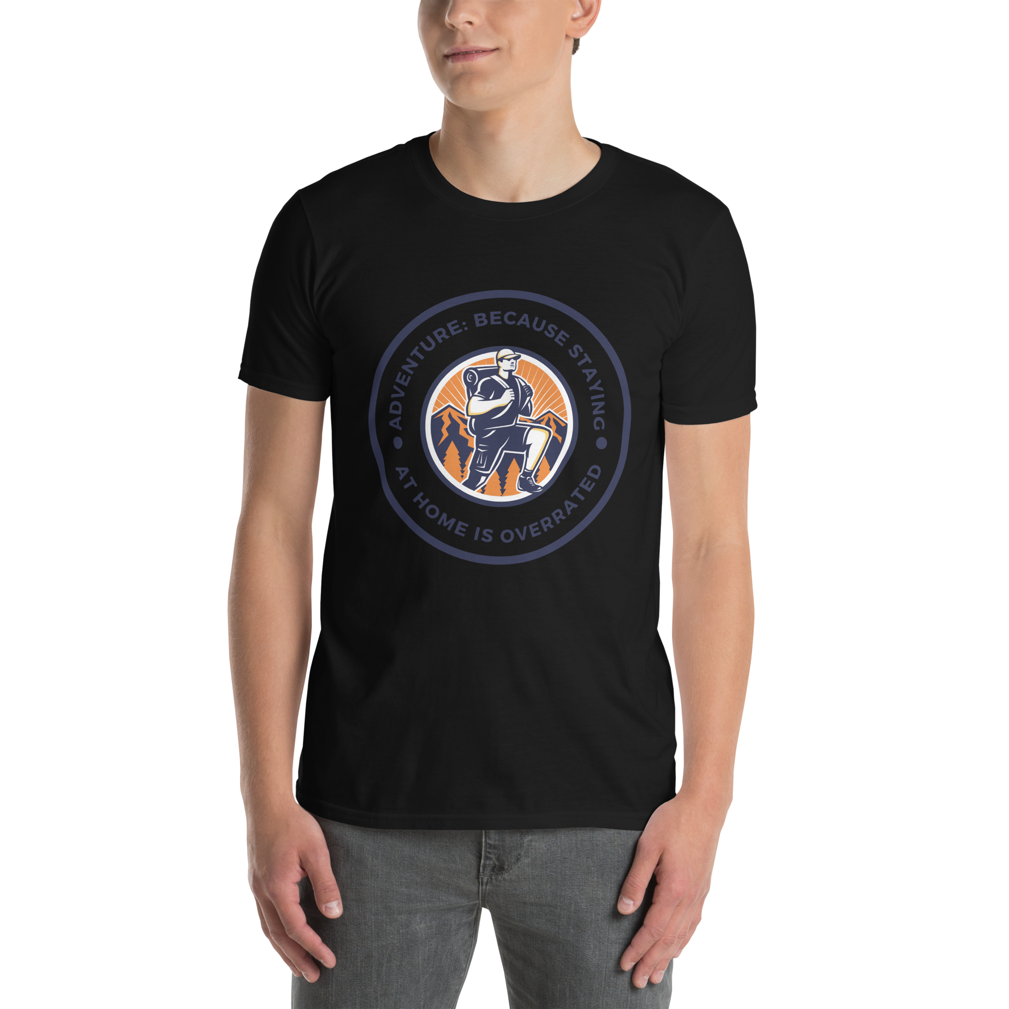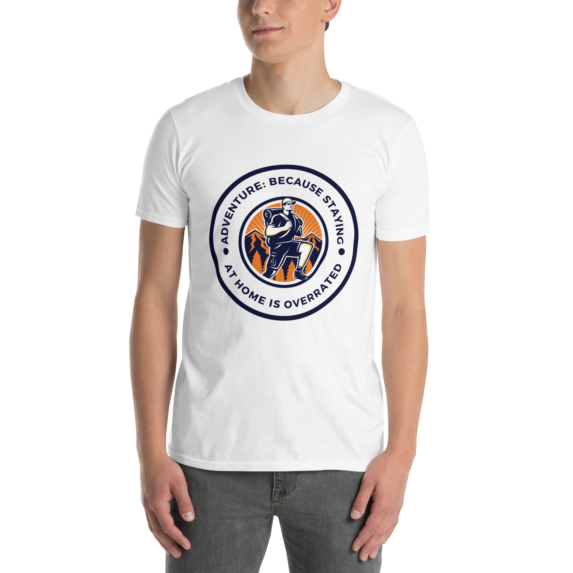 Designed for explorers at heart, this bold badge-style graphic celebrates the call of the wild. Featuring a confident hiker against mountain peaks and sunrise rays, this design speaks to anyone who believes comfort zones are overrated.