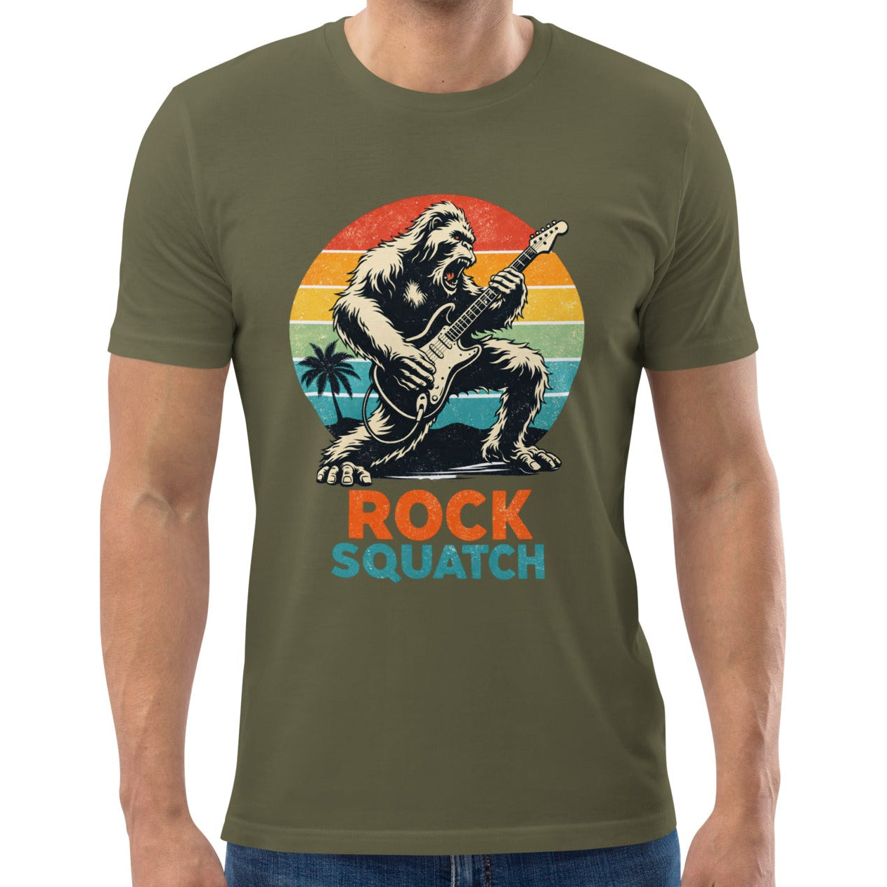 A laid-back Bigfoot guitar design that blends rock music, wilderness folklore, and retro sunset vibes into a relaxed everyday graphic.