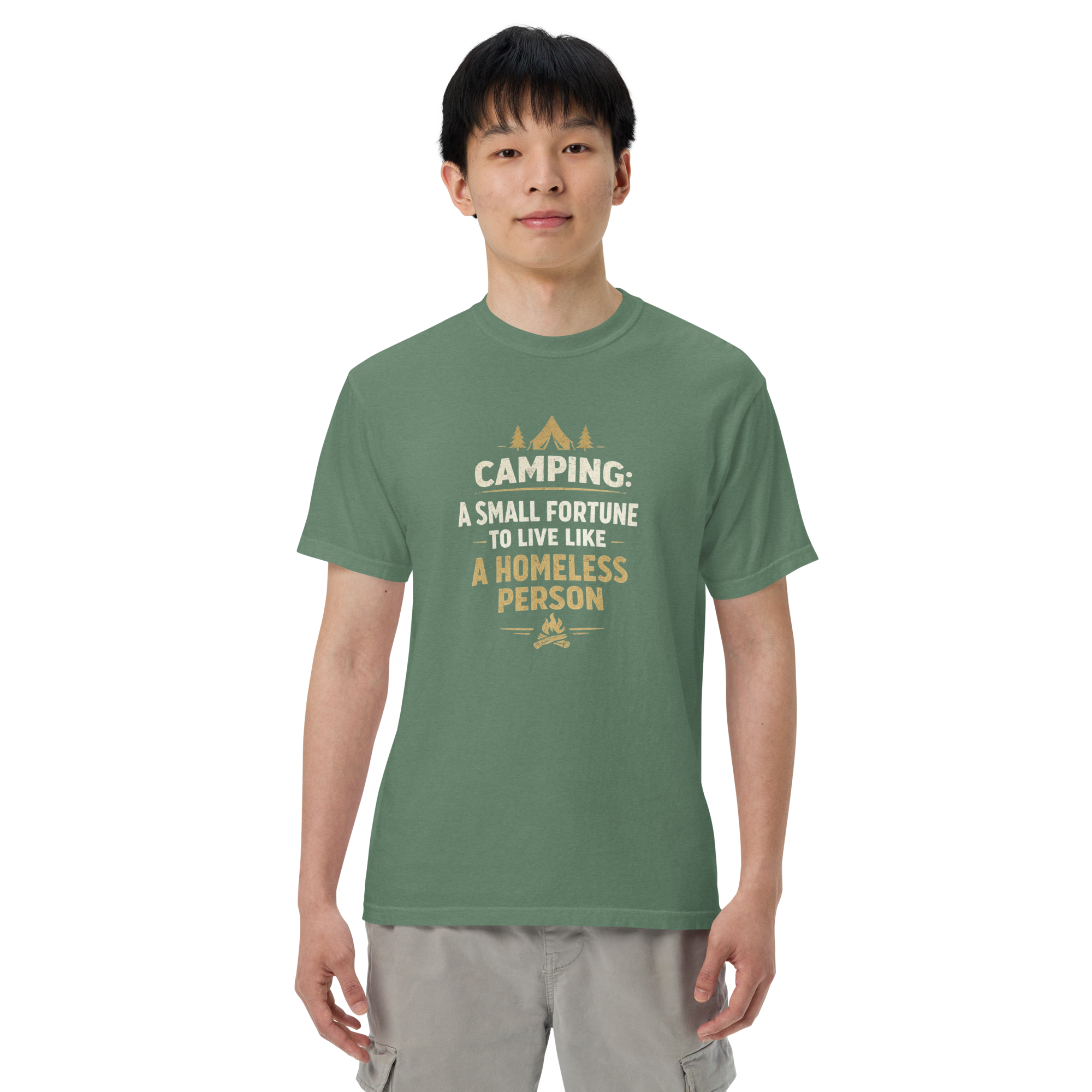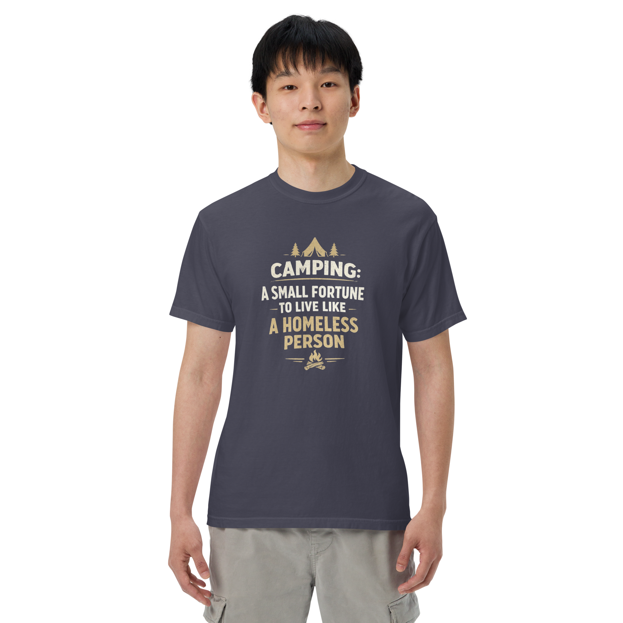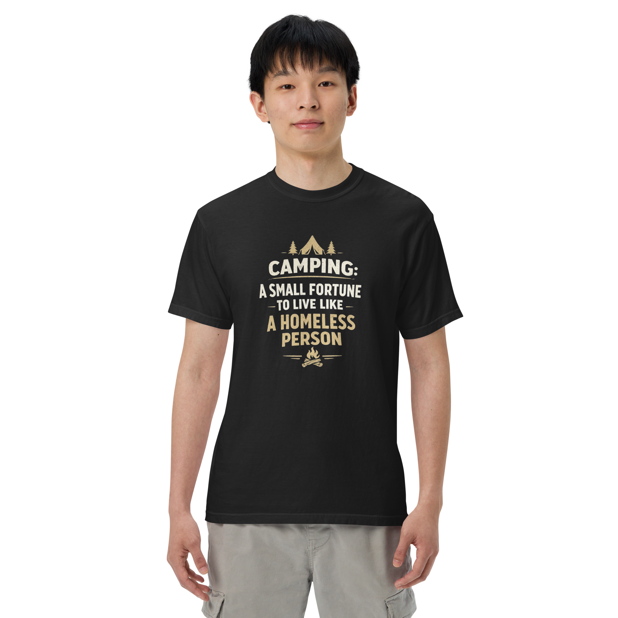 If you’ve ever invested more in gear than the actual trip, this design will feel relatable. Featuring a rustic camping badge with a tent and trees, paired with the witty phrase about spending a small fortune to “live like a homeless person,” this piece captures the ironic charm of outdoor adventures.