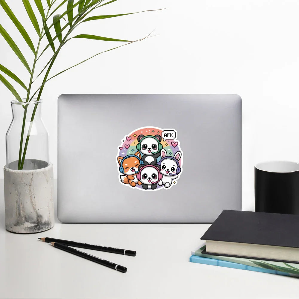Featuring adorable pandas, a bunny, and a fox with colorful headsets, this design blends gamer energy with soft kawaii vibes. Perfect for decorating your gaming rig, laptop, water bottle, or streaming setup.