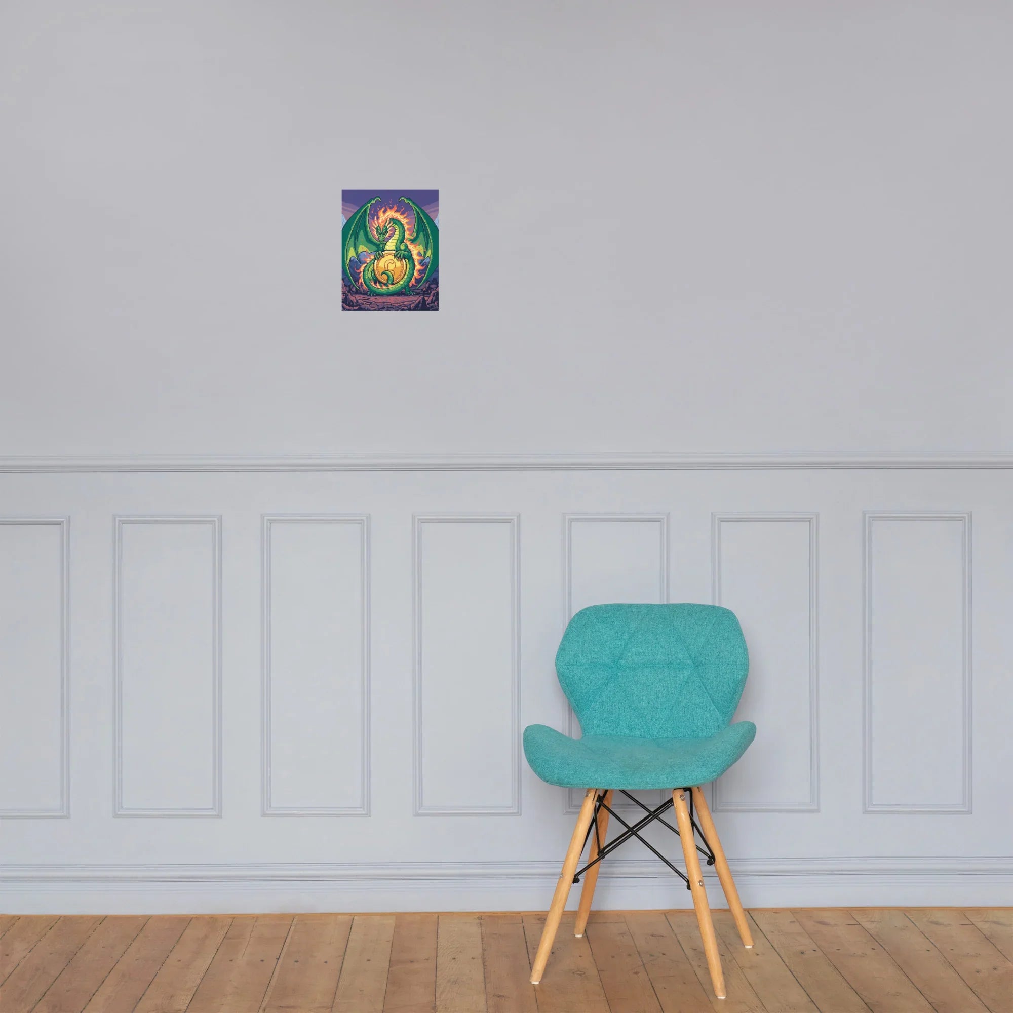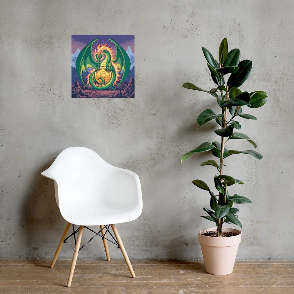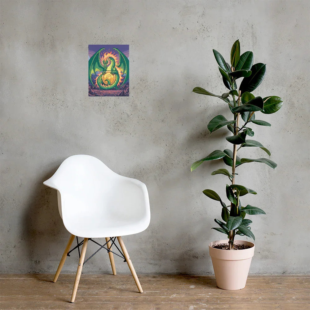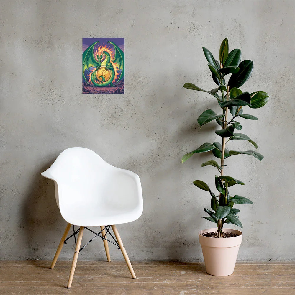 Featuring a colossal emerald dragon engulfed in flame guarding its treasure, this retro-inspired design captures the intensity of classic fantasy boss fights.