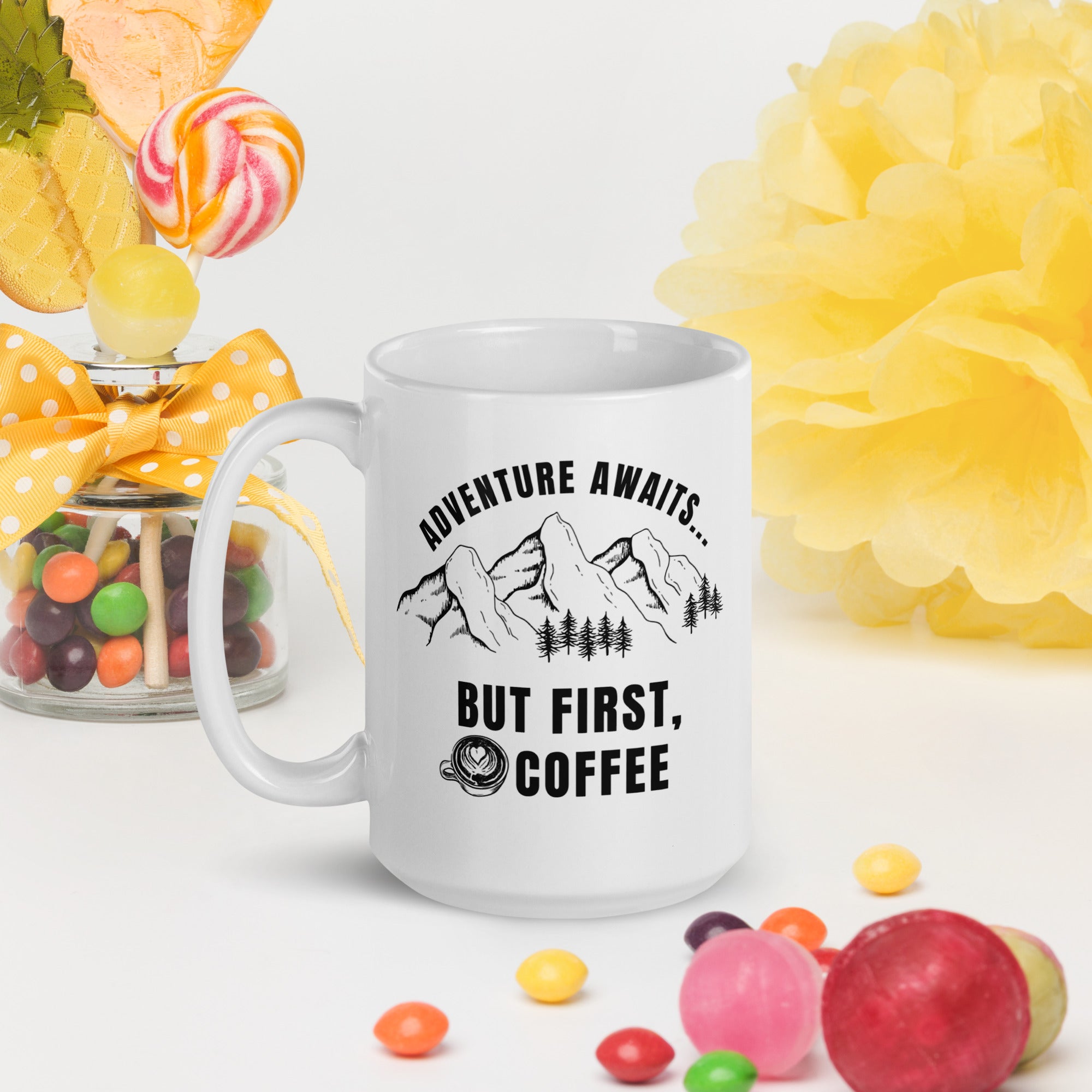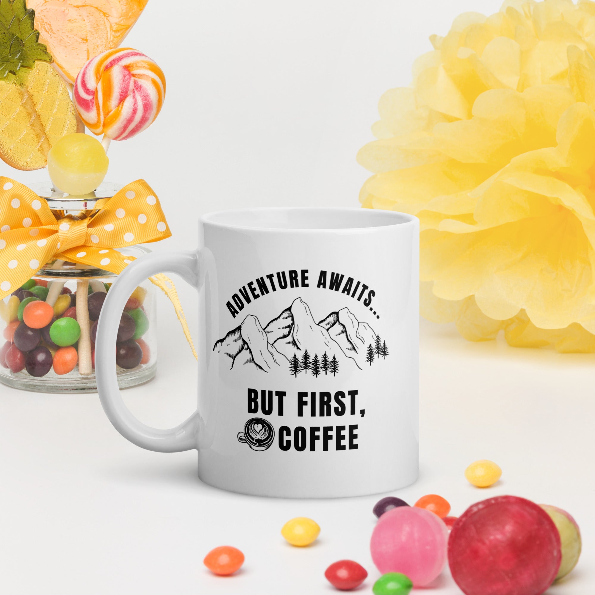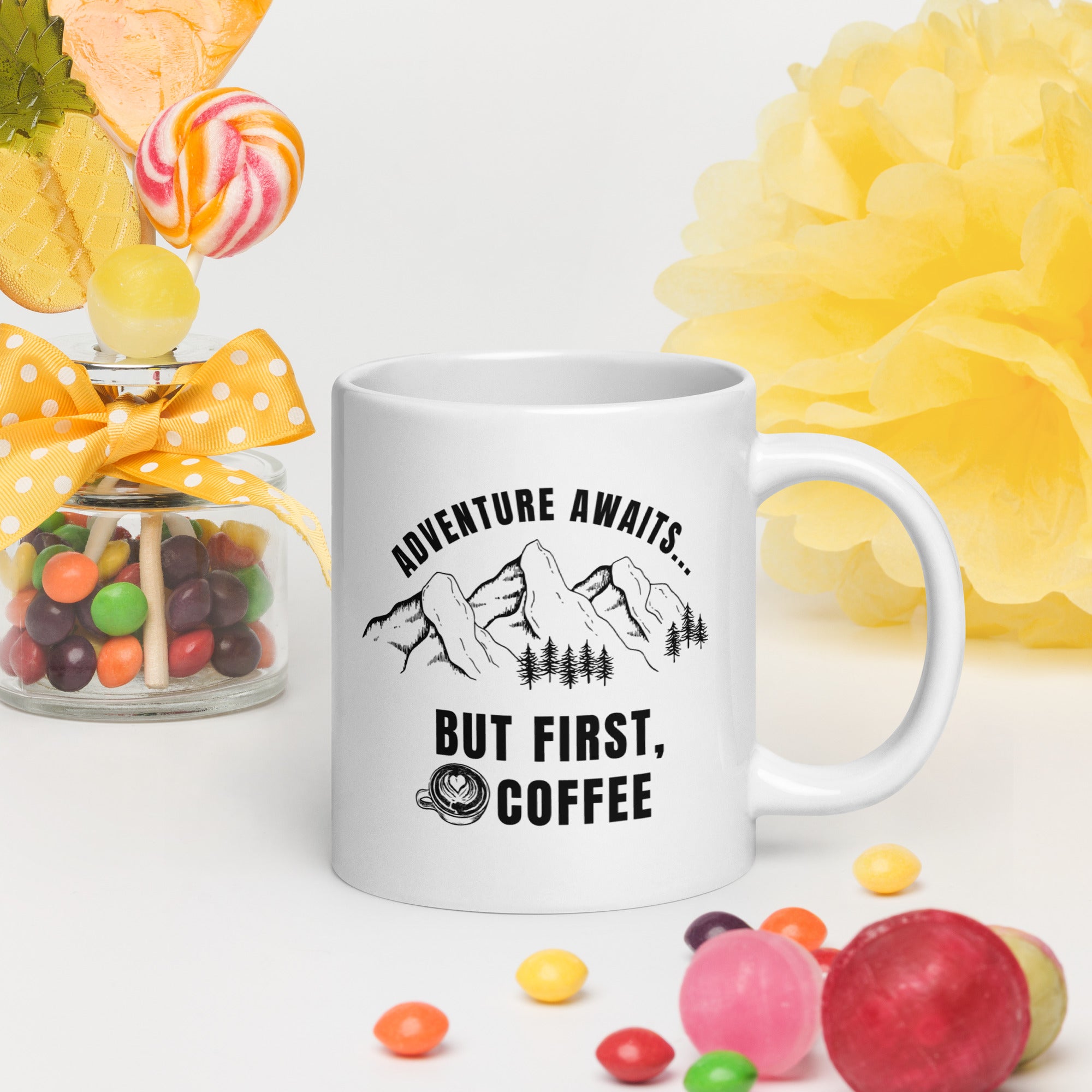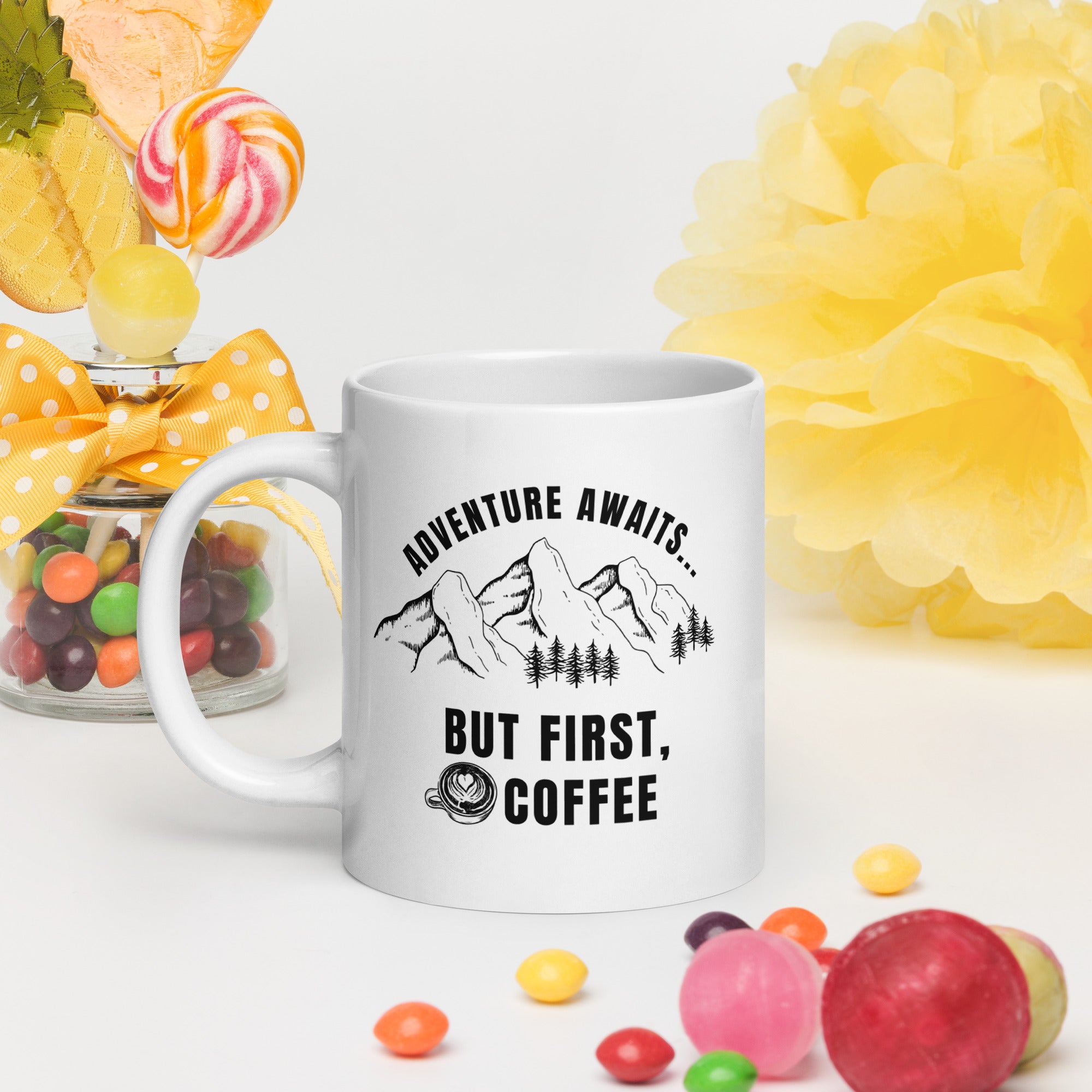 Adventure Awaits But First Coffee Mug – Mountain Coffee Lover Camping Cup
