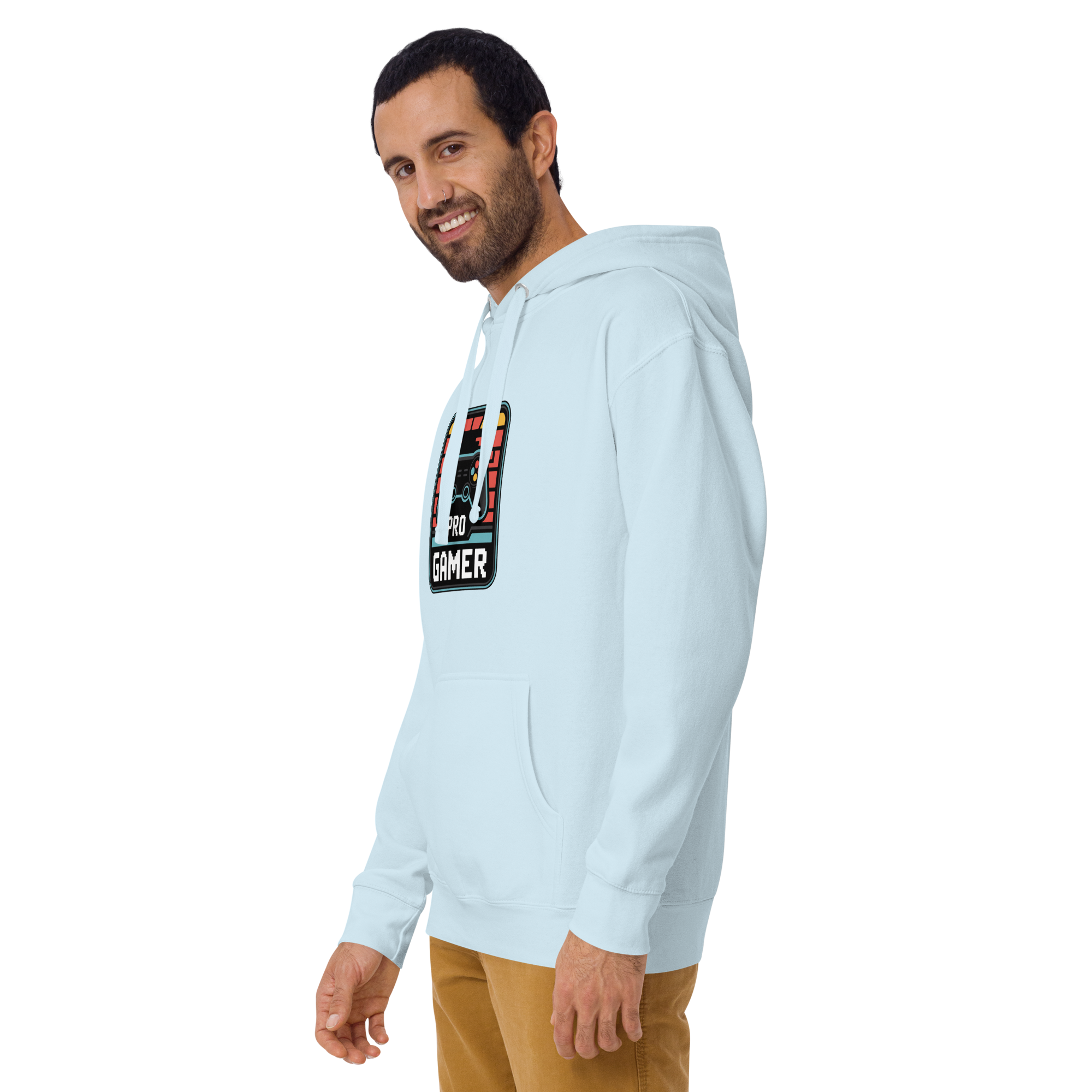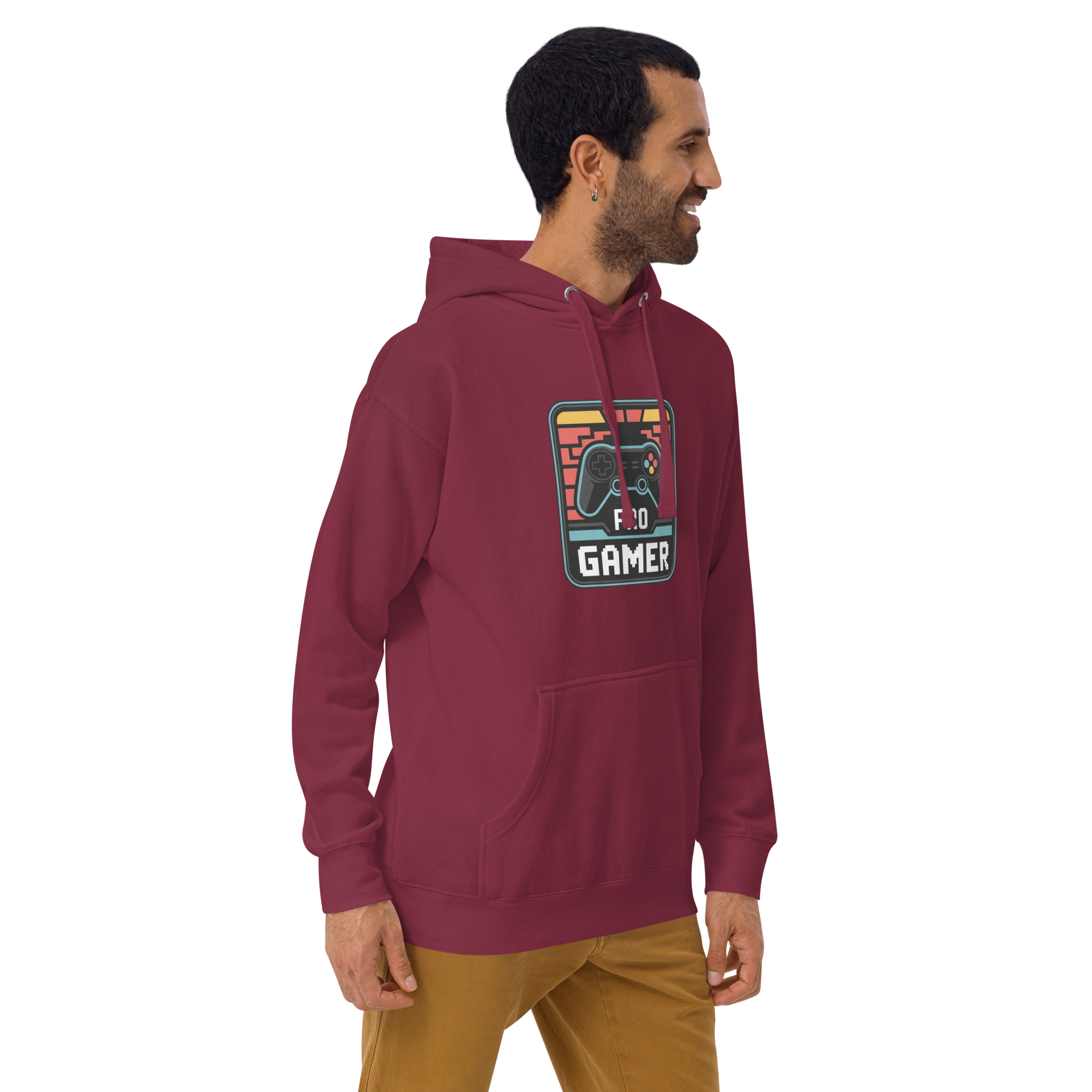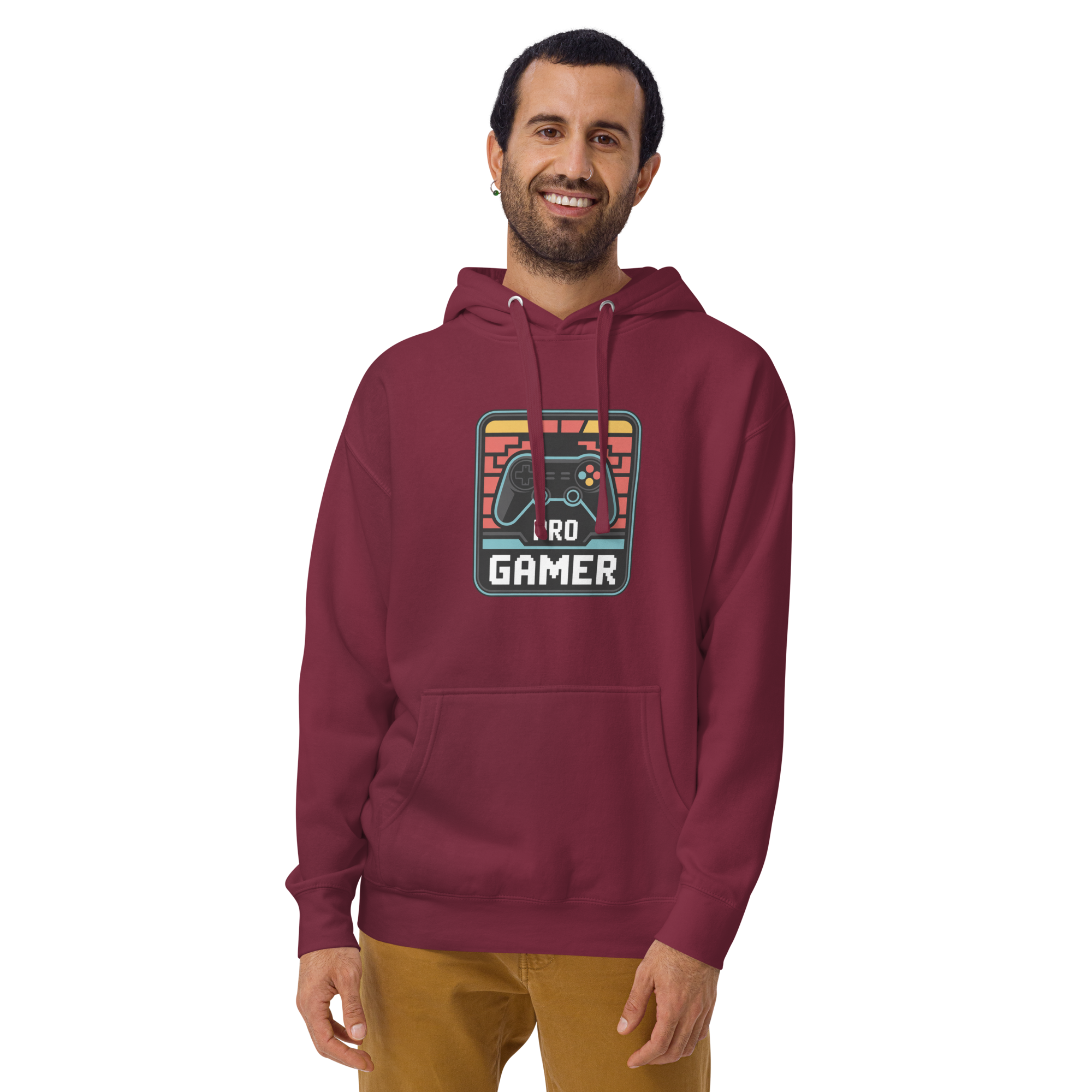 Get cozy in this bold burgundy hoodie featuring a nostalgic pixel-style game controller and "PRO GAMER" badge. Whether you're streaming, questing, or rage-quitting in style — this hoodie is your new default skin.