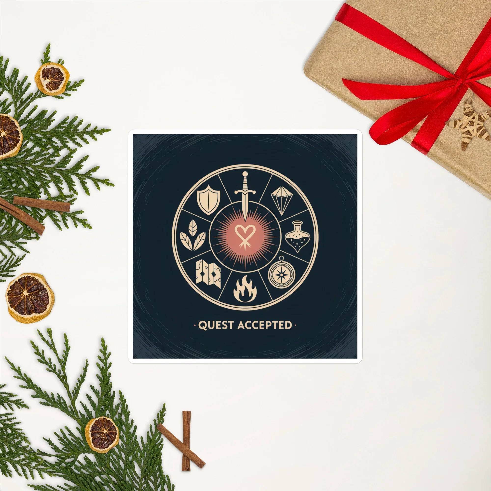 Embark on your next adventure with Quest Accepted, a fantasy-inspired gamer design featuring sword, shield, fire, and potion icons in a magical emblem layout.