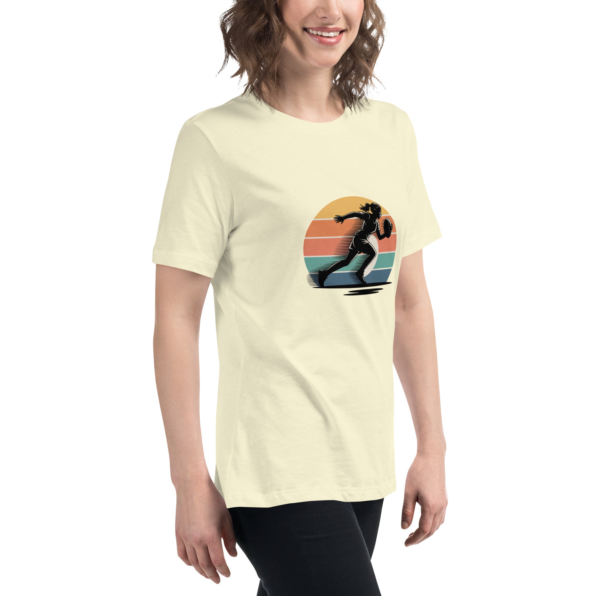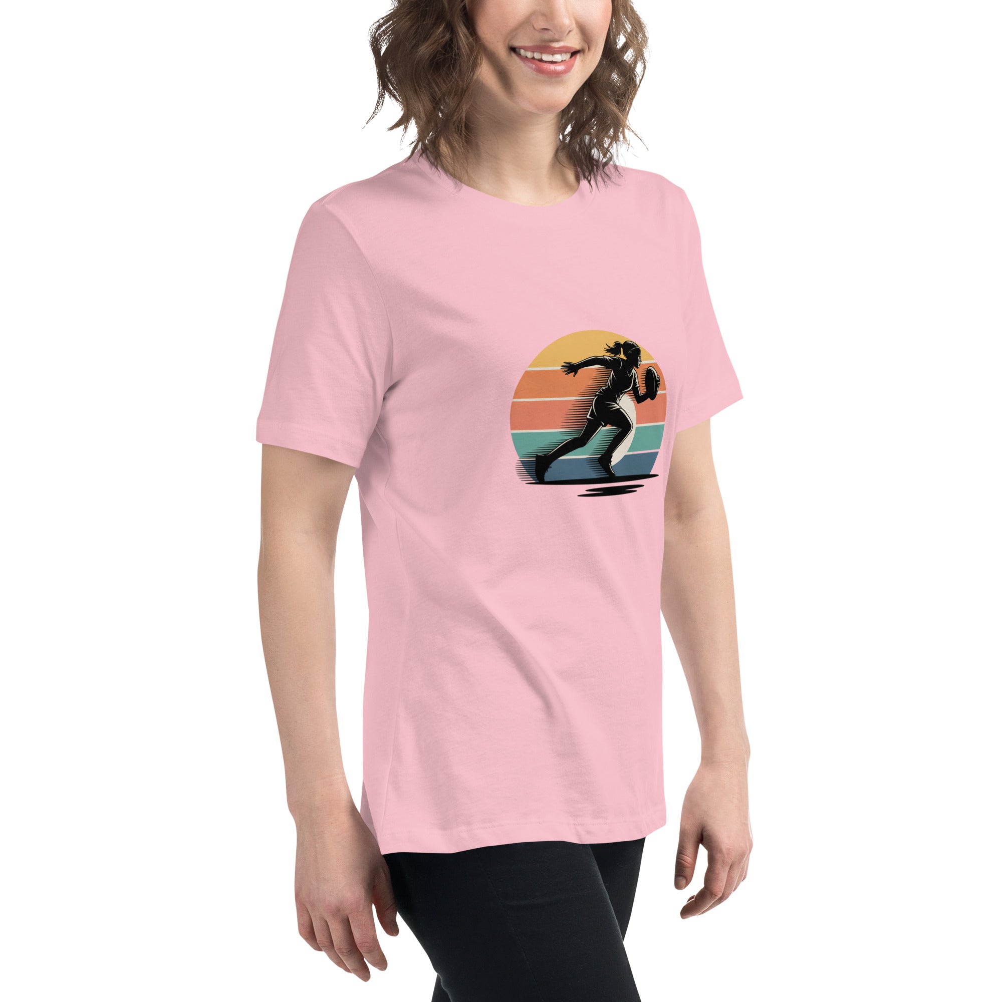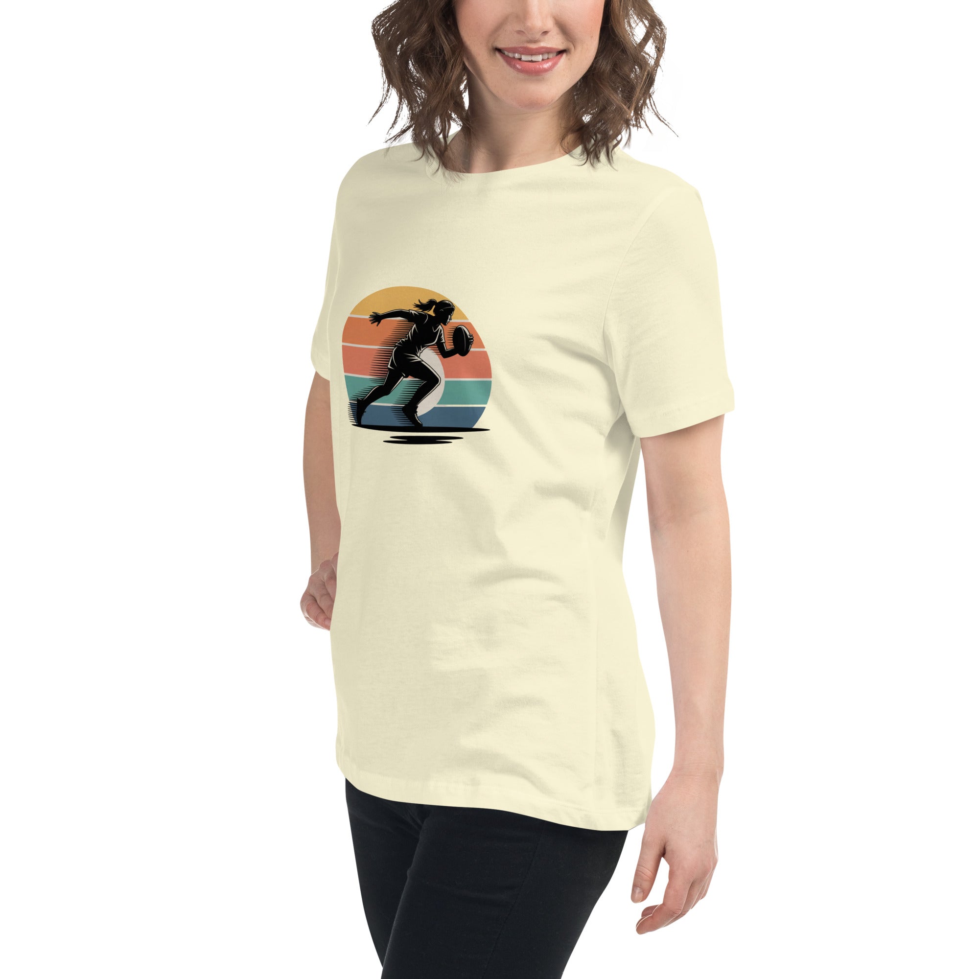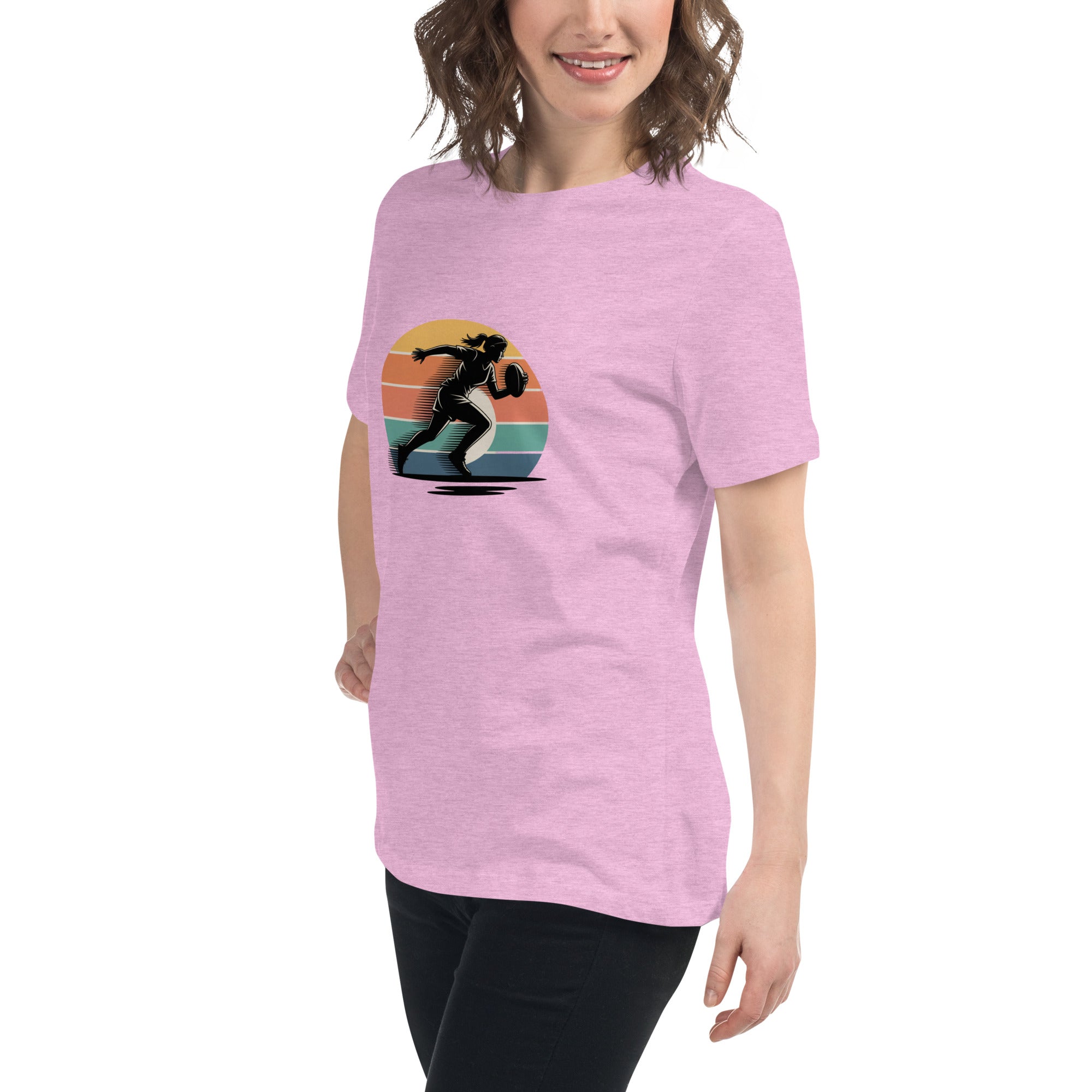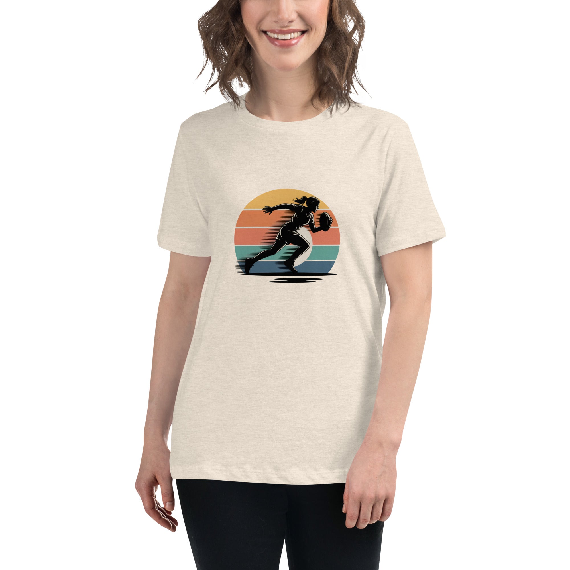 Celebrate speed, spirit, and feminine power with this flowing rugby runner silhouette. Set against a bold sunset, it’s all about motion and momentum.